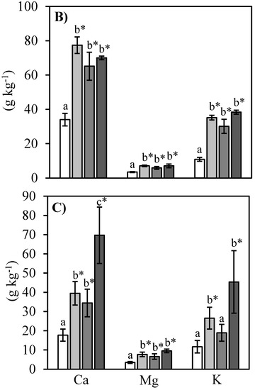Figure 1. Plant nutrient (Ca, Mg, and K) concentrations (±SE) in (A) foliar, (B) stem, and (C) root and tissues of sugar maple seedlings from treatment plots harvested in June 2019, one year after ash addition. Samples from the same plots were bulked prior to analysis. An asterisk (*) indicated p < 0.05 as determined by Dunnett’s post hoc test, where all treatments are compared against the control. Significant differences from pairwise comparisons (Tukey) indicated with different letters. The post hoc tests were completed only on those variables where a significant treatment effect was determined by two-way ANOVA.