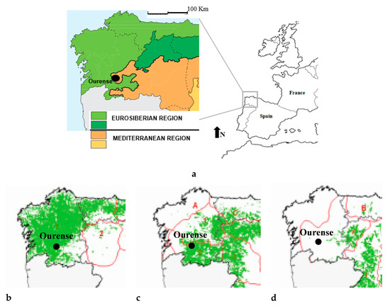 (a) Location of the area of study in the North-western of the Iberian Peninsula at the transition zone between the Eurosiberian and Mediterranean Bioclimatic Regions [19] https://www.ign.es/espmap/mapas_ma_eso/MedioESO_Mapa_06.htm. Distribution of the main oak species in the studied area in green: (b). Q. robur, (c). Q. pyrenaica, (d). Q. ilex sub. ballota (http://especiesforestales.com/fichas.html).