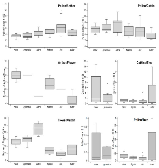 Box-plots of pollen per anther, anthers per flower, flowers per catkin, pollen per catkin, catkins per tree and pollen per tree of the studied Quercus species (robur, pyrenaica, rubra, faginea, ilex and suber). Median (black line), Box: 25–75%, Non-outlier rang (Whisker) and outliers (point). Catkins per tree and pollen per tree plots of Q. robur and pyrenaica values were showed separately in order a better visibility of the scale.