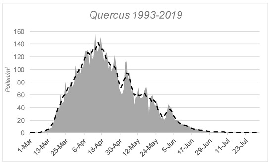 Increases in oak pollen concentrations in the atmosphere could also have a negative impact, as a consequence of the related development of sensitization in allergic people. Some researchers considered this pollen type responsible for major cases of allergies in areas with abundant oak vegetation [21,25]. The maximum concentration values were generally attained between the last week of March and the first two weeks of April, coinciding with the flowering of the most abundant species in the area, Q. robur and Q. pyrenaica [44]. Both species were the main contributors to the oak pollen curve, although Q. ilex was responsible for 10% of airborne pollen in years with high pollen production and favorable weather conditions [3]. Peak concentrations were produced slightly later in certain Mediterranean areas as a consequence of cork oak abundance [7].