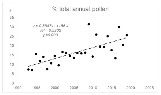 Oak pollen represented, on average, around 14% of the annual total pollen registered in the atmosphere. The percentage varied substantially from year to year, but the highest rates were observed during the last decade (Figure 4).