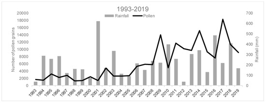 The total rainfall recorded during January, February and March seemed to strongly affect the total oak pollen integral (Figure 6). Regarding the two periods considered separately, significant trends were registered only for the annual pollen integral and the pollen peak during the last 15 years. No statistically significant trends were observed for the exploratory analysis of meteorological variables over the years, with the exception of the increase in maximum temperatures in the entire data set (Table 4). Considering meteorological data of the three previous months to oak flowering, significant trends of maximum temperature decrease (−0.058 °C per year) and mean temperature decrease (−0.071 °C per year) were observed.