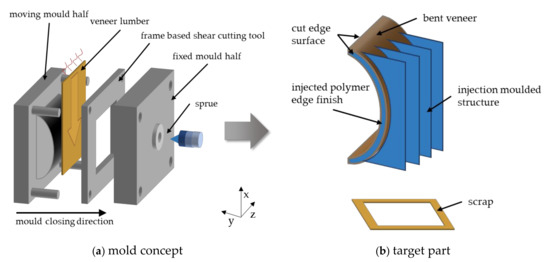 Injection molding is a common manufacturing technology to process polymers. The process offers high quantities in short cycle times and is therefore suitable for high volume production. In Figure 1a, the concept of an injection-molding mold is shown. When the mold closes, the cutting frame is moved and it bends the veneer at the die. When the bending limit of the veneer is reached, the frame cuts the material. The polymer injection follows when the mold is closed. Therefore, the cutting process and the injection-molding process correlate directly. Depending on the cutting behavior of the wood material, specific cutting edges appear and influence the bonding between the different materials. A possible hybrid polymer–wood structure is depicted in Figure 1b. The targeted material combination consists of a cut veneer with polymer edge finish and over-molded polymer ribs acting as a structural reinforcement and functionalization opportunity (e.g., attachment points).