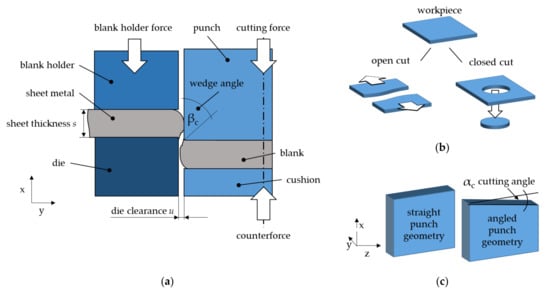 Basic terms of the shear-cutting process (a), and definition for open and closed cut (b) according to [17,20] and punch geometry (c).