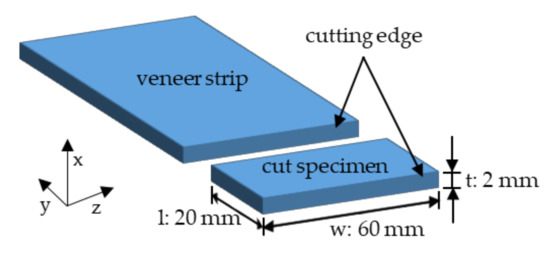 To show the influence of these characteristics, experimental studies on different grain orientations: 0°, 45°, and 90° were conducted. Additionally, the specimens were conditioned differently to show the influence of moisture relating to the wood types. The wood types used for the experiments were beech, birch, oak, and maple, with a thickness of 2 mm. The specific density of the wood types influence the cutting force [26] (p.21). As a basic material, veneer strips were conditioned and cut. The processed specimen and its dimensions are shown in Figure 3. The investigated cutting-edge length was 60 mm.