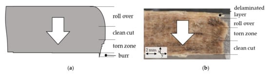 When investigating the cutting edge of the workpiece, there were different characteristic sections measured. The relation of these sections indicated the quality of the cut. Since shear-cutting is mainly used for working metal, there are only guidelines and standards for this material. To enable the evaluation of the veneer specimen, the standard for steel material was applied (VDI 2906 [37]). Typical shear-cutting edges of both materials are displayed in Figure 4.