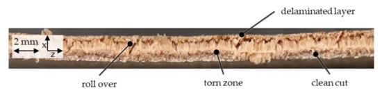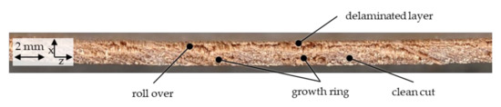 In the shear-cutting process, a bending load occurs, resulting from the shear forces in different planes when shearing the workpiece. This leads to a bended surface that is called roll over. While extending the shear gap, the roll over zone enlarges. A high quality cut has a high ratio of a clean cut, due to an adverse dimensional deviation and high surface roughness in the roll over and the torn zone. The torn zone describes a section where a clear cut is not executed but the material is ripped. Therefore, an undefined surface occurs. The burr section is one of the main negative aspects in shear-cutting steel materials. The appearance of the burr influences the subsequent process steps (e.g., joining) and often requires a cost intensive post-processing of the cutting edge (deburring). Figure 4b shows a micro section view with the cutting edge of 5 mm wood veneer shown. Comparing the veneer to the steel surface, it was observed that the torn zone where the fibers tear apart was situated behind the roll over zone where the fibers were bent. A clean cut appeared at the lower cutting section. It was assumed that the fibers were first compressed and stretched to their maximum, followed by a clear cut. This hypothesis was supported by the deviation in length that the fibers showed in the torn zone. The bended fibers had larger length deviation than the fibers in the clean-cut section, when they sprung back to their initial location. In addition, a delamination in the first millimeters could be detected. The fibers in this section sprung back when the maximum load exceeded and tearing appeared. This effect led to a delamination between the torn fibers and the expanded and bent fibers. In comparison to steel materials, the shear cut of wood did not lead to a burr.