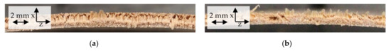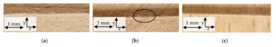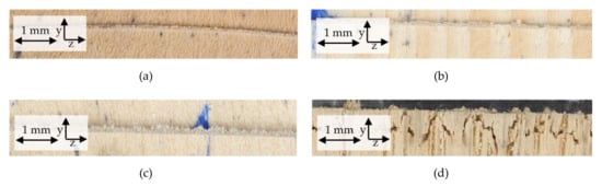 When increasing the moisture of the veneers, the structure of the specimen changes. The wood structure becomes more bendable [9,40]. When comparing the cutting-edge surfaces (cf. Figure 9, γc: 90°), it could be observed that the torn and clean cut zones were indistinguishable. A higher ratio of fibers become bendable, which leads to a higher dimensional deviation of the overall cut, as the section at the upper cutting-edge detects more fiber breakage (Figure 9b). The investigations on the grain direction of γc: 0°showed no differences of surface characteristics.