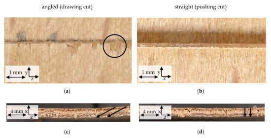 Comparing the section views (Figure 7c,d), it was observed that the torn zone was much smaller for the angled cuts. There was no force applied on the sections to compress the veneer when the tool shape was angled. Further, it was detected that the fiber direction differed due to the angled movement of the punch (cf. arrows Figure 7c,d). The results for γc: 0° did not show relations on the cutting angle. The top views did not change when varying the punch. Especially when comparing the sectional views, the fibers were not influenced in their orientation or the surface characteristics of the cutting edge changed. This was related to the composite structure, while the fibers in γc: 90° were not fixed in their longitudinal position, the fibers in γc: 0° direction were not sheared. The cut led to a shearing in between the fibers. Even when fibers were sheared because of the natural given deviations in the fiber orientation of a specimen, this led to fiber fractions and a frayed cutting edge but not to a difference in the surface characteristics.