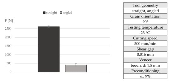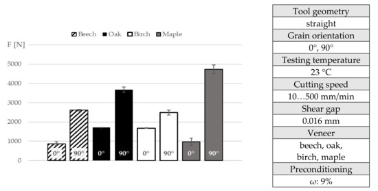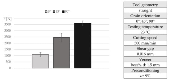 The highest cutting force could be detected at γc = 90°, when compared to γc = 0° for all kinds of wood at all process parameters. This was caused by the cellular structure of the wood (tracheids, growth rings) [9] (p. 107, 126). In Figure 12, the values for beech veneer are shown. As expected, the grain orientation and therewith the amount of dense late wood growth rings influenced the cutting force. The standard deviation for γc = 45° values was higher than that for the other values, which could be referred to the specimen itself. This specific grain orientation led to a different amount of growth rings and therefore to varying strength behavior.