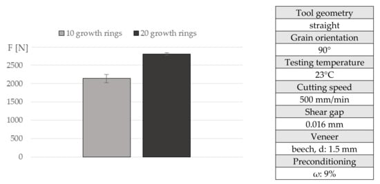 Due to the correlation between the number of growth rings and the cutting force, investigations comparing the values for 10 ± 2 growth rings and 20 ± 2 growth rings were carried out. The results are shown in Figure 13. It could be detected that by halving the amount of growth rings to around 10, the cutting forces were 23.86% lower.