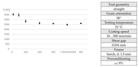 The influence of cutting speed was examined for vc = 10 mm/min to 200 mm/min. The results shown in Figure 14 indicate a regressive trend of the cutting force for higher cutting speeds. Additionally, it was also investigated if the deviation of values lowered higher cutting speeds. There was no significant effect on this between the values of vc = 300 mm/min to vc = 500 mm/min. The cutting-edge quality was increased as well with the higher cutting forces. This phenomenon was related to the properties of the wood structure. When shearing materials, the cutting resistance relate to the tensile strength properties. The strength values depend on the testing velocity, especially for wood materials [41].