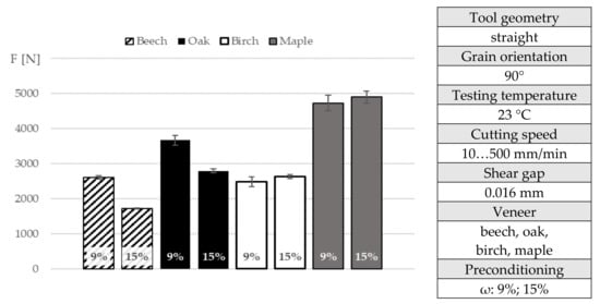 Regarding the moisture influence, it was shown that for beech veneer and oak veneer, the cutting force decreased (beech: –34%; oak: –24%) with higher moisture content. Another relation was detected for the birch and maple veneer, which showed an increasing cutting force (birch: +3%; maple: +6%). The deviations showed that only the values for beech and oak were significant.