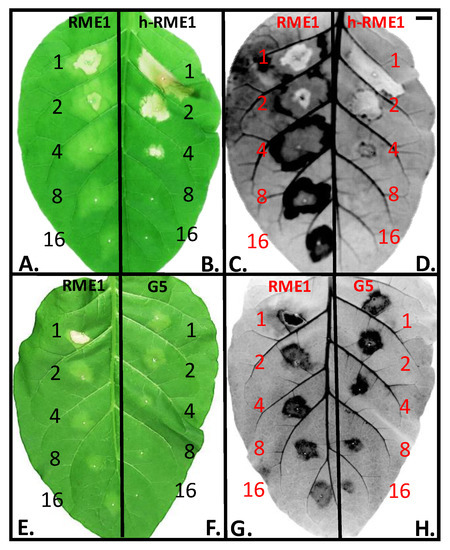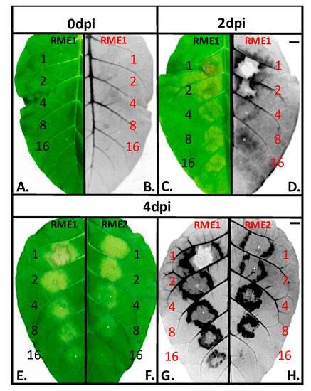 RME2 infiltration induced similar phenotypic symptoms at 4 dpi on tobacco leaves (Figure 1F,H) but reduced the extent of damage. RME2 did not induce necrotic area at 0.19% PP concentration and the low PP concentration (dilution 16) remained symptomless with no chlorotic zone or fluorescent areas detected suggesting the lower potential of RME2 to induce HR-like reactions.