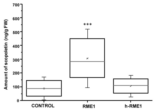 Figure 2. Scopoletin accumulation in tobacco leaves after infiltration of 0.095% polyphenol (PP) concentration of RME1 before (RME1) and after alkaline hydrolysis (h-RME1). Leaves were infiltrated with RME1 or h-RME1 on 20 distinct areas and scopoletin quantification was measured at 4 dpi by HPLC. Each experiment was performed in triplicate (3 leaves per plant, 3 plants). Asterisks indicate significant differences compared with the control (***) p < 0.001.