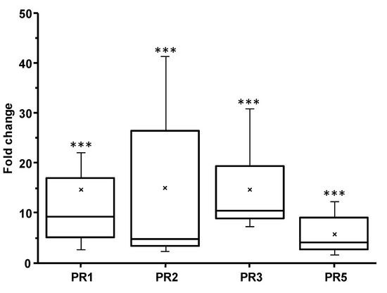 Figure 3. PR transcript accumulation in tobacco leaves 4 days after RME1-spraying. Transcripts were quantified by real-time RT-PCR in treated leaves. Values are expressed relative to control (acidic water treatment) values. Each experiment was performed in triplicate (2 leaves per plant, 3 plants). Asterisks indicate significant differences compared with the control (***) p < 0.001.