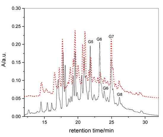 Gallate functions linked to a carbohydrate form the class of PPs named gallotannins. The amount of the gallotannin G5 (five gallate moieties linked to a glucose sugar) was determined using the commercial pentagalloyl glucose as a reference. This was equal to 37.9 mg L−1 in RME1 and to 12 mg L−1 in RME2 at 0.19% in PPs. In G5–G8, the absorbing moieties are the gallate functions and as the light absorption property is additive, the absorption coefficient, ε is expected to be linked to the number of gallate functions in all four structures. With this in mind, we took the corrected G5 coefficient to determine the number of gallate functions for G6–G8. This finally gave the following concentrations of galloyl glucoses: 45 mg L−1 for G6 + G6′, 62 mg L−1 for G7 and 13 mg L−1 for G8 in RME1 and 7 mg L−1 for G6 + G6′, 62 mg L−1 for G7 and 9 mg L−1 for G8 in RME2.