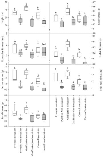 Analysis of variance (two-way ANOVA) was performed to examine the effects of independent variables, (biochar type and inoculation) and their interaction on the dependent variables seedling height (cm), RCD (mm), biomass (g) of leaves, stem, root, nodule, and total plant, nodule number with 8 replications, and N content (mg) and isotopic N (δ15N × 1000) with 4 replications (SPSS Inc., Chicago, IL, USA). Data were log-transformed to meet the required assumptions for analysis (noted in tables and figures where applicable) when assumptions for equal variances and normality were not met. Significant treatment effects were determined using Duncan’s tests. Results were considered significant at α = 0.05. Visualizations for the robust presentation and comparison of relative values were created using SigmaPlot (version 12.5; Systat Software, San Jose, CA, USA).