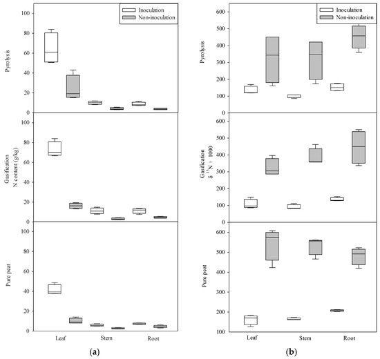In our study, combining the addition of pyrolytic biochar with inoculation sometimes had a synergistic effect on seedling growth compared to those only inoculated, whereas addition of gasifier biochar always had a synergistic effect (Figure 1). An improved growth of seedlings provided by a combination of biochar and inoculation with microorganisms has been noted for maize [16], soybean [66], groundnut [52], and neem (Melia azedarach L. [67]). Inoculation and subsequent BNF within nodules dilute the proportion of N supplied by fertilization (i.e., increases N content within the plants). Interestingly, the root δ15N of seedlings cultivated with biochar was higher than the δ15N leaf and stem values (Figure 2), suggesting that N provided by the fertilizer and absorbed from the soil accumulated more in the roots of inoculated seedlings, whereas in non-inoculated seedlings it was more readily transferred to the aerial portions of the seedlings.