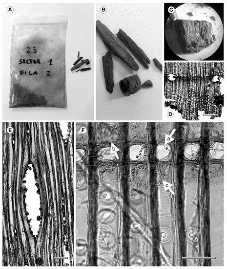 To identify the wood and determine whether it had suffered any attacks, part of one of the samples taken (Figure 1A–C) was used, with orientations in three sections—transverse, tangential, and radial. The process of softening, staining, and mounting was performed following the methodology of [7]. For light microscopy observation, the wood was softened in a 50/50 water/glycerol mixture for 30 min. Microscope slides of 15–20 micrometers were prepared using a LEICA SM2400 microtome (Leica, Holly, MI, USA). Slides were stained in a mixture of 0.5 g safranine powder, 100 mL distilled water, and 100 mL 96% alcohol. Excess safranine was removed with 96% alcohol and slides were dehydrated with 96% alcohol and pure alcohol, respectively, before mounting with Eukitt. The samples used for observation in scanning electron microscopy (SEM) were also oriented in their three sections and dried for 24 h at 80 °C, then adhered to an aluminum metal disc 20 mm in diameter using conducting tape. After reaching a vacuum, all the material was coated by gold/palladium sputtering for 90 s at 60 mA. Observations were also made using a LEICA mod. DM2500 light microscope (Leica Microsystems Inc., Buffalo Grove, IL, USA) with a DFC420 camera (Leica Microsystems Inc., Buffalo Grove, IL, USA), image processing software IM50 v.5 release 220, and scanning electron microscopy (SEM) mod. JEOL JSM-6380. The wood anatomy was described following [14]. The descriptions in [15] and [16] were used to identify the wood.
