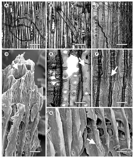 (A–C,G) Fungi hyphae. (D) Chains of cavities inside secondary wall due to soft-rot, (E) Advanced state of deterioration of cell wall, F, Trabecula inside axial tracheids, (G) Hyphae. Scale bars—A, 350 μm; B, 200 μm; C, 100 μm; D, E, F, G, 50 μm.