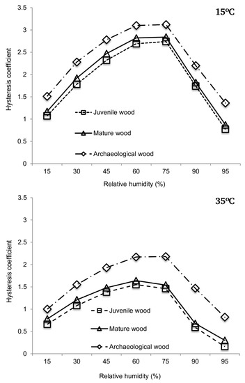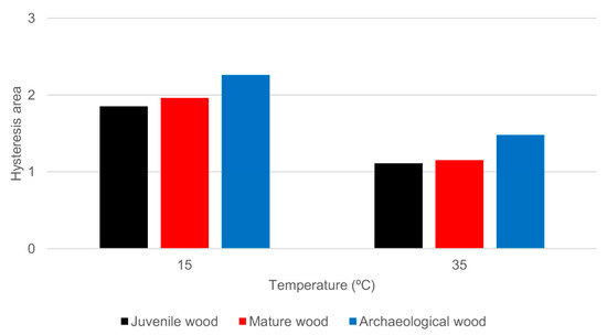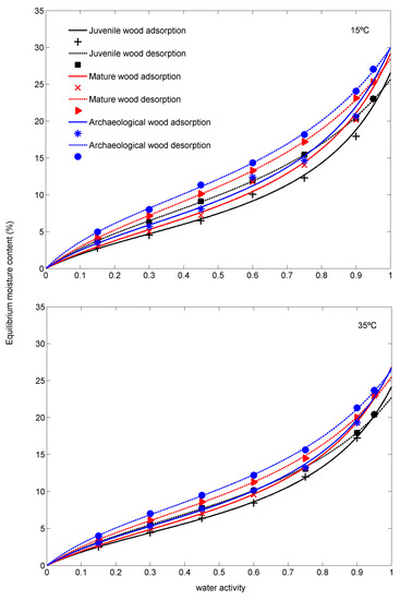 The isotherms of the juvenile wood (Figure 3, supplementary material: Table S1) are below the isotherms of the mature wood, as previously reported by [23] in Abies pinsapo (Boiss.) wood, and the isotherms of both these woods are in turn below those of the archaeological wood, in both adsorption and desorption, at 15 °C and 35 °C.