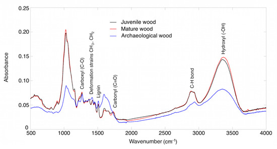 ATR-FTIR spectrum of juvenile, mature, and archaeological wood.