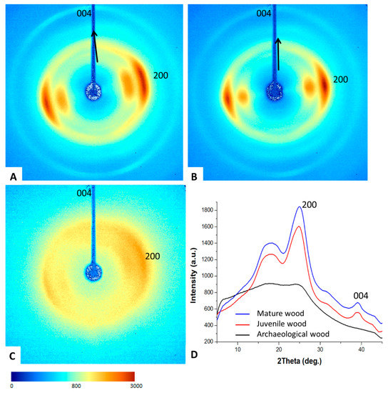 Wood crystallinity and structural organization were studied using 2D X-ray diffraction (2D-XRD). The 2D-XRD patterns of the juvenile and mature wood show a characteristic fiber texture produced by cellulose Iβ crystals preferentially oriented with their c-axis aligned parallel to the wood fibers (Figure 7A,B). The pattern of the mature wood is very similar to that of the juvenile wood, although the former has a slightly greater degree of preferential orientation (smaller AS values; Table 3). These patterns are very similar to other untreated wood or cotton fibers made of aligned cellulose crystals [28,41]. In contrast, the archaeological wood diffracts more weakly and produces rings with nearly homogeneous intensity, indicating that they are formed by randomly oriented cellulose crystals (Figure 7C). The decreased scattering intensity of X-rays of this sample can be attributed to a wood density loss due to degradation. Nevertheless, there is some weak arcing superimposed on the rings, indicating that a small fraction of cellulose crystals remains preferentially oriented parallel to the fibers. The angular scattering of cellulose crystals remains very high (AS up to 74.6°) compared to what occurs with the juvenile and mature wood (AS 29.9°–35.8°), indicating that cellulose crystals in the archaeological wood have an almost random orientation (Table 3). In addition, the 2Theta scans calculated show considerable differences between the three samples. The juvenile and mature wood have well defined 004 and 200 diffraction peaks, whereas the archaeological wood shows much broader (FWHM_200 10.31° in the archaeological wood compared to 3.96° in the mature wood) and weaker diffraction peaks, indicating that the archaeological wood has a much lower degree of crystallinity and is nearly amorphous. Additionally, juvenile and mature wood has a notable anisotropic peak broadening (FWHM of 200 and 004 reflections is 4.18°–3.96° and 2.19°–2.25°, respectively) due to the elongated shape of cellulose crystallites (20 × 37 Å) as estimated from peak broadening using the Scherrer equation [28].