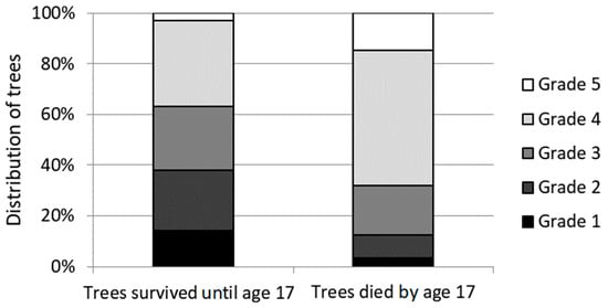 Tree distribution among the needle cast damage grades (1–5) for trees that survived until the age of 17 years and trees that died at the age of 6 to 17 years.
