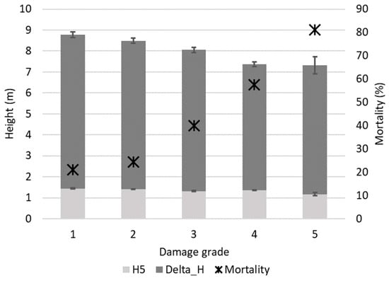 At the age of five years, the mean values ± 95% confidence intervals of the tree height and diameter at the root collar were 130 ± 1.0 cm and 25 ± 0.2 mm, respectively. At the age of 17 years, corresponding values of tree height and DBH were 8 ± 0.1 m and 9 ± 0.1 cm, respectively. The tree dimensions among the damage grades differed significantly, with less-damaged trees being significantly (p < 0.05) higher than more-damaged trees (Figure 2).