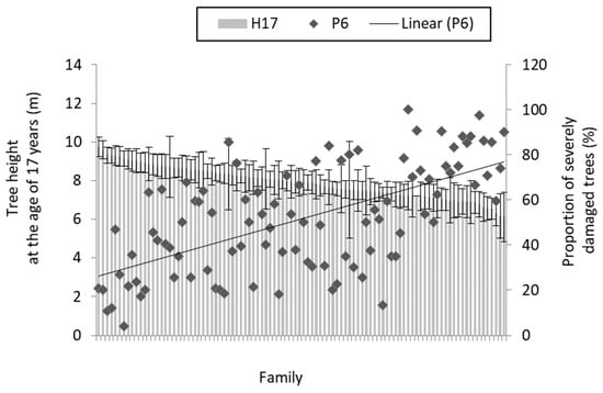 The relation between tree height at the age of 17 years (H17) and proportion of severely damaged (pooled grades 4 and 5) trees in the sixth growing season (P6) at the family mean level (families ordered descending according to mean height). Whiskers denote 95% confidence intervals.