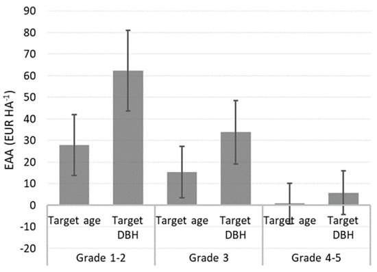 Simulation results indicated a significant (p < 0.01) effect of needle cast damage on EAA. At both the target age (101 years) and target DBH (≥35 cm), the seriously damaged (grades 4 to 5) group of Scots pine had a significantly lower EAA than the group of undamaged or slightly damaged (grades 1 to 2) trees, regardless of the density at the age of 17 years, commercial thinning regime, or price level (Figure 4, Table S4). For all damage levels, EAA at the final harvest according to the target DBH was more than double compared to the target age of 101 years. The target DBH for grades 1 to 2, 3, and 4 to 5 were reached on average at the age of 64, 77, and 97 years, respectively. The mean EAA reached 62.3 ± 18.7 EUR ha−1 for damage grades 1 to 2 at the final harvest time according to the target DBH, whereas it was lowest (0.8 ± 9.4 EUR ha−1) for trees with grades 4 to 5 at the conventional final harvest time (Figure 4).