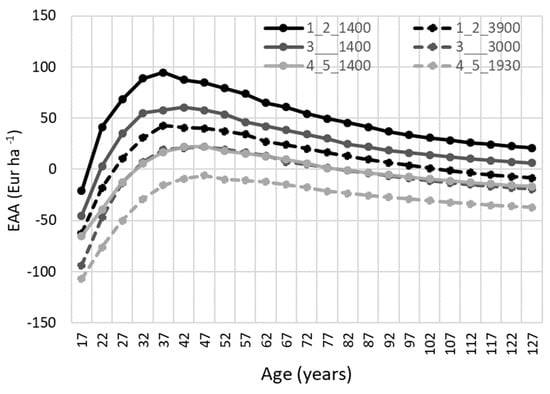In all simulated scenarios, the EAA reached the peak at the age of 35 to 45, tending to culminate earlier for groups with less needle cast damage and lower stand density at the age of 17 years (Figure 5). Regarding different commercial thinning regimes, the highest EAA for all groups was reached by applying a moderate commercial thinning regime, when relative density is reduced from 0.95 to 0.70 (Table S4). When applying a rate of 4%, the calculations for all price levels showed a similar tendency of EAA dynamics. The highest EAA during the simulated period was for the least damaged trees (grades 1 to 2) with a density of 1400 trees ha−1 at the age of 17 years, whereas the lowest EAA was estimated for seriously damaged trees in the actual density scenario (1930 trees ha−1), reaching positive values only at the maximum price level. For all needle cast damage levels, EAA was lower for the higher initial density at the age of 17 years compared to the intensive early management scenario (Table S4). Nevertheless, all scenarios applying a rate of 4% had a negative EAA at the minimum price level, whereas the scenarios with lower density at the age of 17 years for groups with grades 1 to 3 showed a stable tendency to maintain positive EAA during the simulation period for the average and maximum price levels.