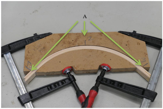 Our approach was to simplify the problem into a common form. A stack of wooden laminations can be molded into quite complex forms. The simplest form would be the shape of an arc. Just like in a three-point bending machine scenario, the internal radius is under compression while the external radius is under tension. In contrast to Chanda et al. [10], the wooden material was not damaged during the bending.