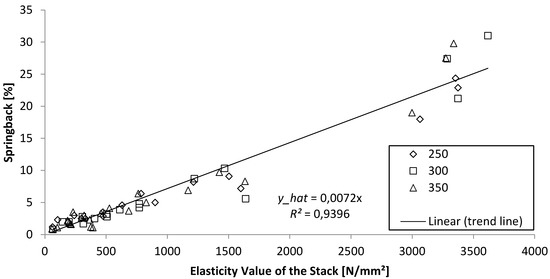 The elasticity value of the stack directly correlates to the number of laminations. The more laminations used in the stack, the smaller the measured elasticity value of the stack. Elasticity value and springback of the sample behave linearly, where higher elasticity values lead to higher springback (Figure 3). The sample values suggest a line from the origin. For obvious reasons, a natural material will never reach zero elasticity and, therefore, zero springback. But it shows that formed parts should be made from multilayer materials to minimize springback. According to the calculation in R, the p value of the slope is very small at 7.487725 × 10−43, which means that the slope value to determine y_hat is significant. The gap between 1600 N/mm2 and 3000 N/mm2 is a natural phenomenon due to the fact that the sheets were not glued yet. There is an exponential correlation between the number of laminations and the elasticity value which explains the increasingly smaller distances between clusters, e.g., the number of laminations for the elasticity value from approximately 300 N/mm2 is two, while stacks with three laminations can be found to have a value of elasticity between 1200 N/mm2 and 1700 N/mm2. The higher the number of laminations, the lower the elasticity value. However, an overlap of elasticity values can be seen in samples with more laminations.