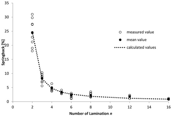 In general, one can see the more laminations in a stack, the smaller the springback will be. A marked decrease in springback can be seen by increasing the number of laminations from 2 to 3. Higher numbers of laminations show that the springback is distributed within the standard deviation. Although the deviation is highest in those samples with two and three laminations, a trend is noticeable. Figure 4 shows the correlation between the number of laminations in a stack and the springback value in %. The trend line is the solved power function (function 15) and is quite accurate considering that stacks consist of laminations with different thicknesses.