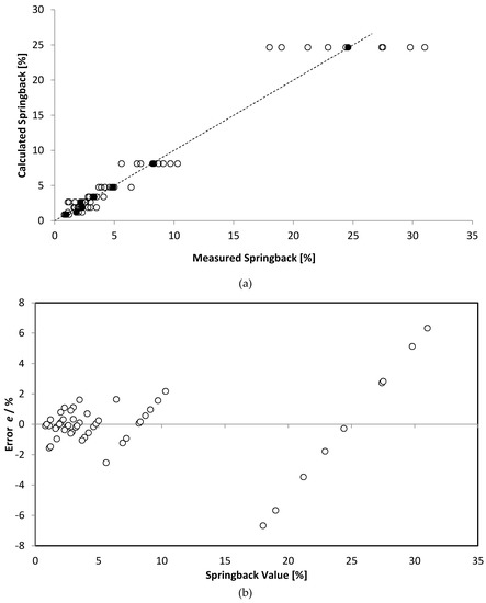 (a) Parity plot of all 57 springback values (circle) and mean values (black dot) obtained by measurement and calculation with the formula (12). (b) Error plot of all 57 springback values (circle) obtained by measurement and calculation with the formula (12).