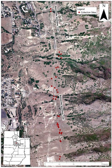 An overhead view of the locations of the 34 netleaf hackberry fruit collection sites (shown with red dots) along the Bonneville Shoreline Trail in foothills of the Wasatch Mountains, east of Provo, Utah, USA. Seventeen collection sites utilized fruits embedded in coyote scats deposited along the trail, while the other sites involved collecting fresh fruit directly from 17 nearby netleaf hackberry shrubs. Collections were done on 5–7 November 2018.