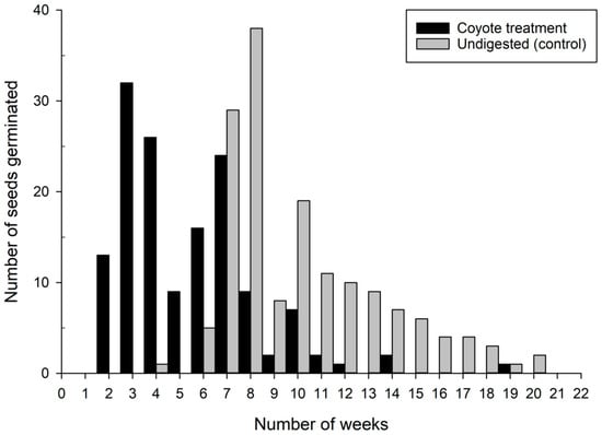 The number of netleaf hackberry seeds that germinated after being planted on 28–29 March 2019, in the Utah Valley University greenhouse, and the number of weeks it took each to germinate for coyote-treatment fruits (n = 144) and undigested controls (n = 157).