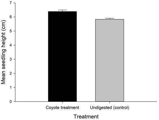 By 7 August 2019 (131 days after planting), the seedlings from coyote-treatment seeds were 9.5% taller than seedlings derived from undigested fruit (6.4 vs. 5.8 cm, respectively; t-ratio = 96.880, df = 1, p < 0.001; Figure 3). Among the seedlings from the fresh-picked fruit, there were marginal height differences among the 17 half-sibling families (F-ratio = 1.539, df = 16, p = 0.095). Percent survival from germination to 7 August 2019 was extremely high for both the coyote-treatment seedlings (96.6%) and the undigested controls (100%).