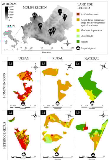 In order to produce a landscape photo sequence covering the whole urban–rural–natural gradient, a land use interpretation was performed. A sample of 15 oblique photographs, five for each urban, rural and natural landscape domain, was taken along an altitudinal gradient and from representative viewpoints in the Molise region. Photos were taken on sunny days during September 2018. Using a 25 m digital elevation model (DEM), and knowing camera position, orientation, and field of view, we assigned real-world locations to each of the photograph pixels, producing 15 viewsheds, of which we interpreted land-use types. Through the photointerpretation of color aerial orthophotos from 2015 (nominal geometric resolution: 0.5 m), five land-use types have been distinguished and mapped with a minimum mapping unit of 500 m2 in order to discriminate TOF: (1) artificial surfaces; (2) arable land, permanent crops and heterogeneous agricultural areas; (3) meadows and pastures; (4) forests; (5) shrublands. These maps were used to calculate three landscape metrics using the “Patch Analyst” tool in the ESRI ArcGIS® software package. Patch density (PD), land-use class density (CD) and Shannon’s diversity index (SDI) (see [27] for further details on these metrics) were calculated for each viewshed, and then normalized to a 0–1 interval by the min-max method of ranging [28]. Finally, a test for checking the absence of correlation between metrics was performed (Spearman ρ < |0.8|). These metrics were chosen because of their proved correlation with landscape preference [29] as well as their ability to describe landscape structure irrespective of the area extent [30]. The average of these normalized metrics’ values was calculated and assumed as an index of landscape heterogeneity (H indexv) (see Table A1 in Appendix A). Finally, three pairs of photographs, and their related viewsheds, were selected from those showing the lowest and highest H indexv within each landscape domain (urban, rural and natural) (Figure 1). In this way, an urban–rural–natural landscape gradient was recreated as follows: