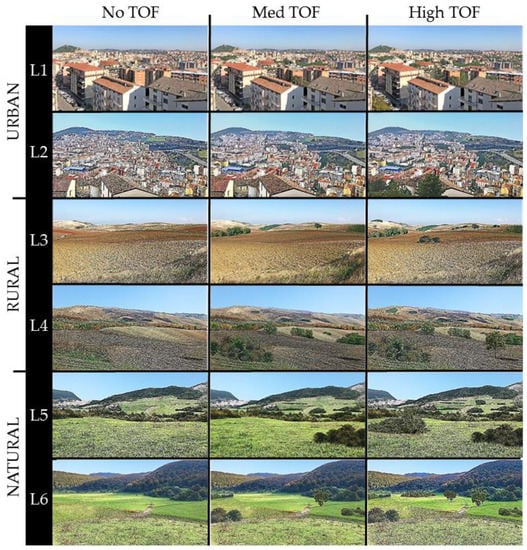 The six selected photos were then modified using a raster graphic editor in order to obtain six triplets of photos each with three different levels of TOF cover (Figure 2). First editing aimed to (i) remove all TOF present in original photos, (ii) harmonize exposure and saturation values, and (iii) eliminate clouds as plausible misleading stimuli on observer perception [31]. Accordingly, the first photo of each triplet referred to the absence of TOF (No TOF). In the second photo of each triplet, TOF was added until covering 1.7% of the viewshed area (Med TOF), which corresponded to the current TOF coverage in Molise region [26]. Finally, the third photo of each triplet was modified by adding TOF elements until reaching a relatively high TOF cover of 3.4% of the viewshed area (High TOF), equal to twice the average value of TOF cover in Molise region. TOF were added within 1.5 km from the snapshot point, as the maximum visual threshold for clearly discerning individual elements such as trees [17].