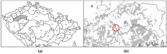 Forest regions of the Czech Republic; (a) Region 9 Rakovnik-Kladno’s upland; (b) Location of case study area (CSA) (gray parts represent forest area distribution).