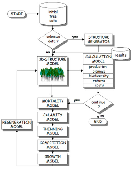 The core growth sub-model was initially designed by [53]. It is an empirical model that was parameterized and validated using national forest inventory data from Slovakia and Germany and also calibrated for the Czech Republic. The most characteristic features are (i) the ability to generate a realistic 3D structure of a forest stand; (ii) the ability to take into account the influence of stand density, and inter- and intra-specific competition among individual trees on their growth; (iii) the ecological evaluation of site fertility; (iv) the ability to simulate natural tree mortality and practically any type of forest stand silviculture treatment; (v) the possibility to provide a vast spectrum of output information about the wood production, and economic and ecological characteristics of the stand.