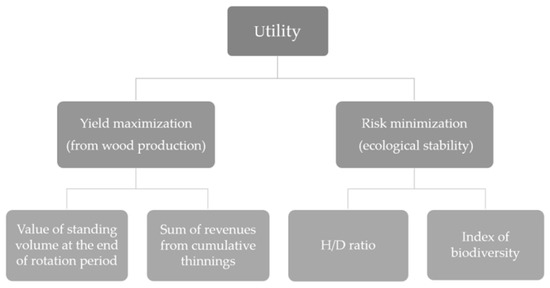 For each type of potential forest owner, we assumed some distribution of the relative weights assigned to each indicator based on our expert expectations. Thus, we simulated the behavior of different types of potential owners, allowing us to select the optimal tending system for each representative stand. Subsequently, we could study the influence of different demands on the balance between the financial incomes and risks (as decisions of different risk-to-reward investors) and the influence of different ecological stability of managed forests on the attributes of an optimal tending system.