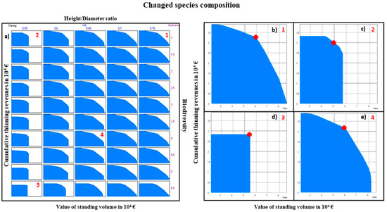 Figure 4b–e are the individual graphs selected from the larger matrix corresponding to the expected preferences and behaviors of the different potential types of forest owners as decision-makers. We simulated an economically oriented risk-seeking decision-maker by choosing Figure 4b. It is the graph with the largest gray area, representing high economic returns from cumulative thinning and standing volume values at the age f 90 years. At the same time, it is the graph with an extremely low level of biodiversity and a high H/D, indicating an expected acceptance of high risk. Subsequently, we simulated the forest owner’s selection of the position of the target point (vector) on the Pareto boundary in the selected 2D graph. The target point is marked with a red cross in the graphs. By this selection, the simulated owner type determines which combination of revenues from final felling and revenues from thinning he/she prefers at an accepted level of H/D and biodiversity. Here, it was expected that an economically oriented risk-seeking owner would prefer slightly higher continuous revenues from thinning (y-axis) over revenues from final cuttings of the standing volume (x-axis), due to the small area of the considered CSA.