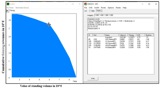 After rendering the maps of the target space, the results are available to the forest owner for review. In the second step, the potential forest owner expresses the preferences for optimization goals/indicators and selects a non-dominated tending system that best meets those preferences. In this step, the RGM method is used, which allows the easy identification of a small number of tending alternatives that best reflect the desired objectives. The selection of the optimal alternative is made by simply marking the position in the drawn map of the target space (defining the desired values of indicators). Then, the software tries to find all the real tending alternatives that are close to the selected point using the RGM method. The alternatives found are provided to the forest owners in the form of a list in which they are sorted by distance from the selected (ideal) goal-point selected at the Pareto frontier.