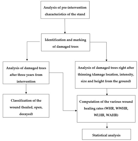 - Tavankar, F.; Bonyad, A.; Marchi, E.; Venanzi, R.; Picchio, R. Effect of logging wounds on diameter growth of beech (Fagus orientalis Lipsky) trees following selection cutting in Caspian forests of Iran. N. Z. J. For. Sci. 2015, 45, 19. [Google Scholar] [CrossRef]