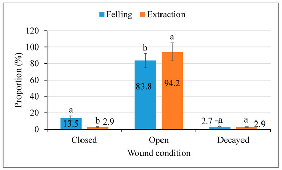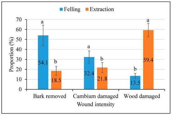 - Hecht, U.; Kohnle, U.; Nill, M.; Grüner, J.; Metzler, B. Bark wounds caused by felling are more susceptible to discoloration and decay than wounds caused by extraction in European beech. Ann. For. Sci. 2015, 72, 731–740. [Google Scholar] [CrossRef]