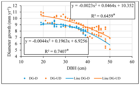 | Diameter at breast height (cm) | 38.4 ± 6.2 | 35.9 ± 5.7 | 2.298 * | - |